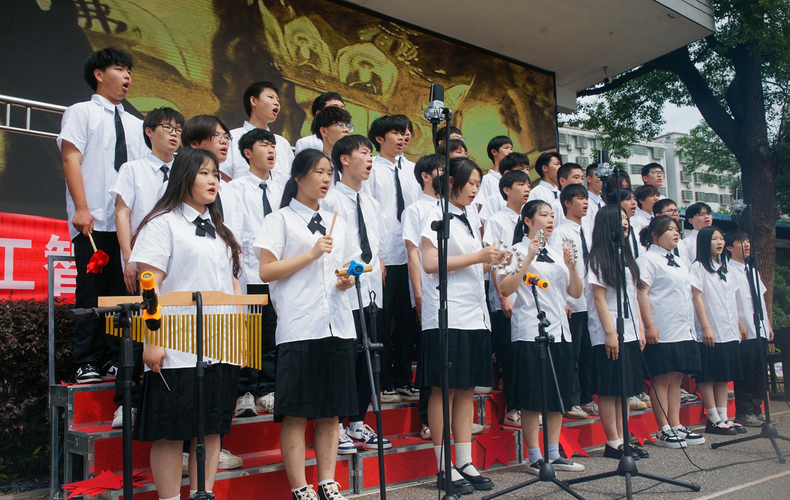 此外,比赛中还展现了校园文化的多彩魅力。各班级精心设计口号、统一服装、制作道具,用舞蹈、手势、队列等形式演绎歌曲。